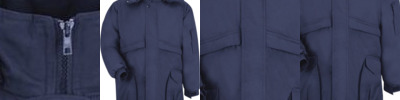 - Two-way concealed Nomex® tape, brass, break-away zipper, concealed snap at top of zipper and at neck