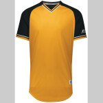 The Classic V-Neck Jersey by Russell Athletic® combines a vintage look with modern fabric technology. It features the latest 100% polyester wicking knit with color secure® technology that helps prevent dye migration from screen printing. This retro jersey evokes baseball legends while anticipating future greatness.